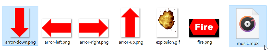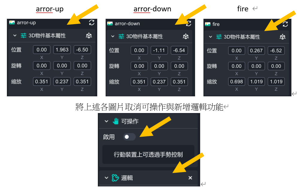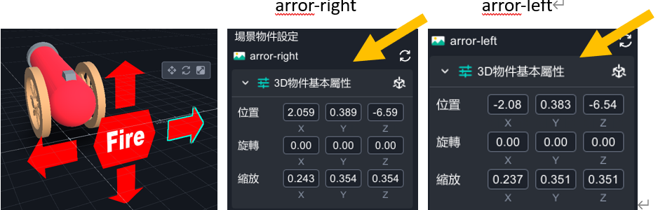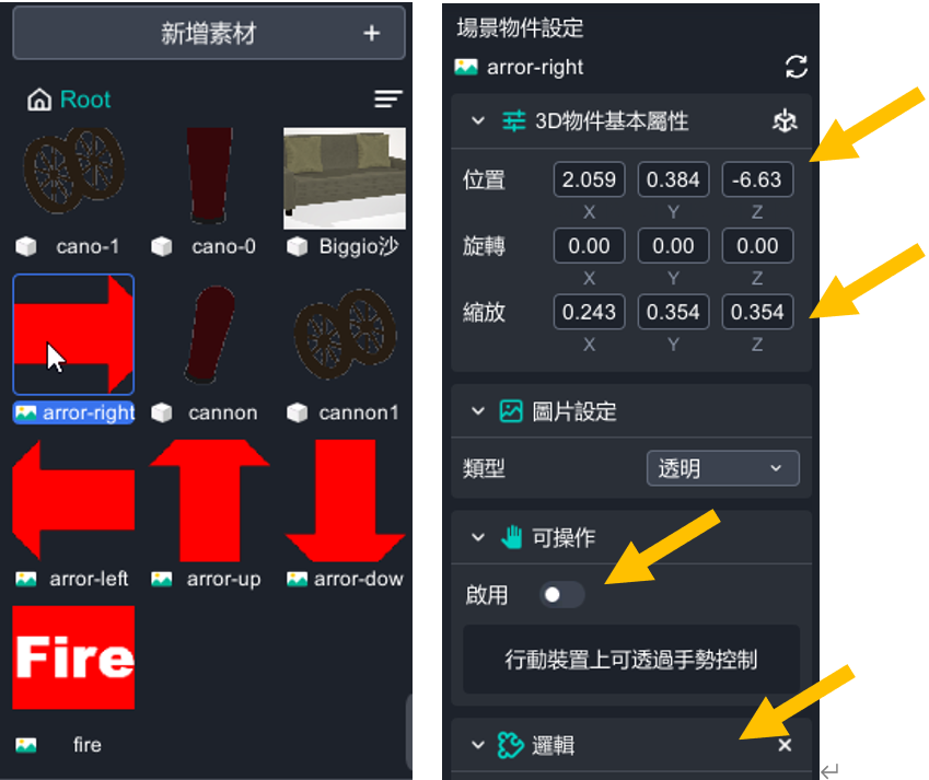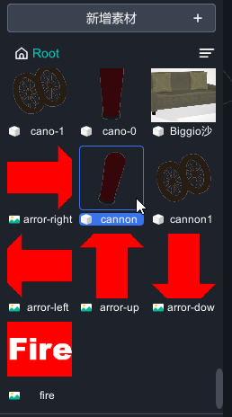 9. Next on, drag the image of arror-right,arror-left,arror-up,arror-down,fire to the scene, and edit position, rotate, scale.