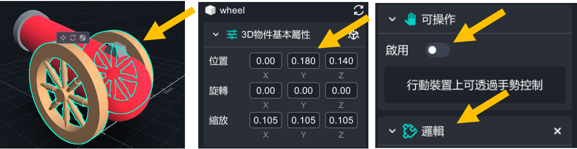 8. Drag the object of wheel to the scene and edit position, rotate, scale. Cancel interactable and add action logic.