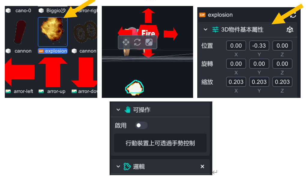 12. Drag the video of explosion to the scene, and edit position, rotate, scale. Cancel interactable and add action logic.