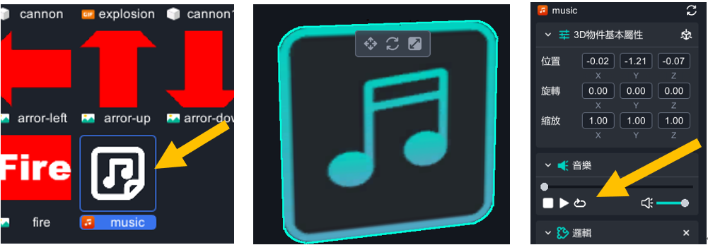 13. Drag the music to the scene and edit its position. Cancel interactable and add action logic.