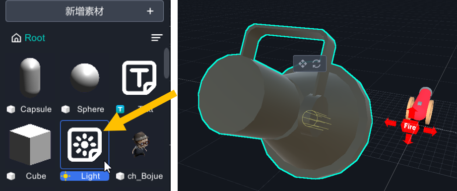 arror-rightt, arror-left, arror-up, arror-down, fire, drag these five objects to the "wheel" object to make them become a group. Being a group is the most convenient way in MAKAR. So that there would be a triangle icon on the left top. You can open and close these objects easily.