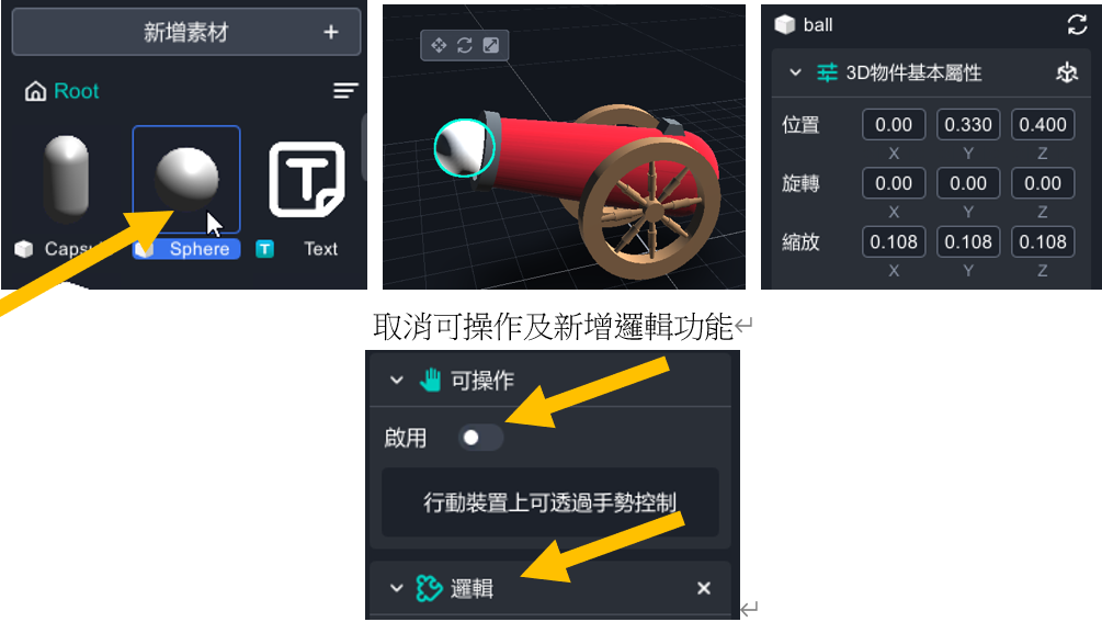 15. Drag Sphere to the scene, and edit the position and size. Cancel interactable and add action logic.