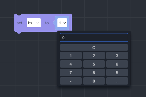 3. Click ”Data” > “1”, and drag it to the bx blockly’s right side. Edit value to 0.