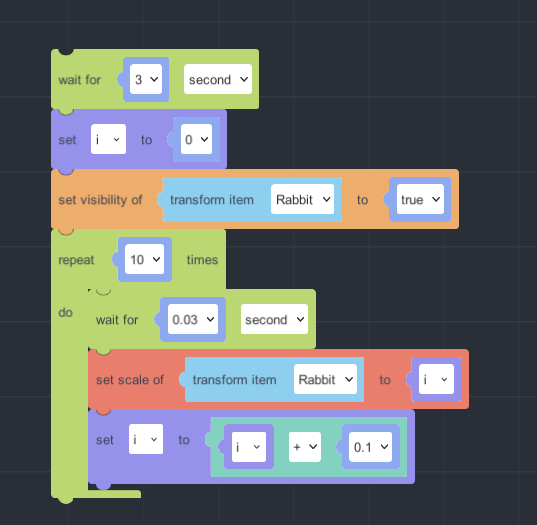 Next, three things happen simultaneously: the giftbox fades out, the magic ball appears and fades out, and the rabbits fade in. The logic program needs to achieve the fade-out effect (i.e., shrinking to no volume) and the fade-in effect (expanding from no volume to normal volume).